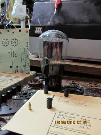 Als Ergebnis gibt es eine glimmende Röhre. Und auf dem vorigen Bild war der Messzeiger noch fast in Ruhestellung. Bei dieser Röhre zeigte er um diese Zeit gute Funktion an.