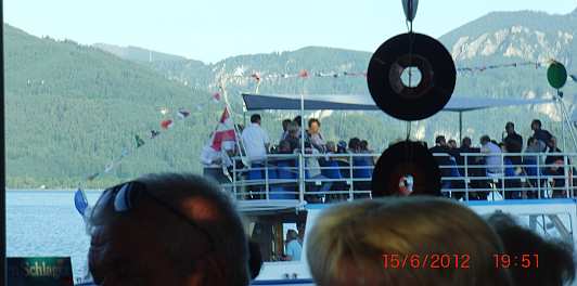 Noch bevor die Mondseeland abgelegt hat, fährt die Herzog Odilo schon wieder voll besetzt auf den See hinaus. Die haben wohl auch Livemusik mit an Board